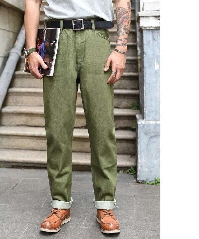 柔らかな質感のヴィンテージデニムパンツ。鮮やかなオリーブグリーンの色合いと、クラシックなシルエットが特徴。折り返しデザインの裾と、上質なボタン、ポケットがアクセントに。カジュアルからフォーマルまで幅広いシーンで活躍するスタイリッシュさを兼ね備えた1着。 | ウエスト | ヒップ | 股上 | 太もも周囲 | 裆脚 | ズボン丈 | | 73 | 94.5 | 27 | 29 | 17 | 108 | | 76 | 100 | 28 | 30.5 | 17.5 | 108 | | 79 | 102.5 | 29 | 31 | 18 | 109 | | 81 | 105 | 30 | 31.5 | 18.5 | 110 | | 84 | 107.5 | 31 | 32 | 19 | 111 | | 86 | 110 | 32 | 33 | 19.5 | 112 | | 93 | 115 | 33 | 34 | 20 | 113 | | 99 | 119 | 34 | 35 | 20.5 | 114 | | 体重(KG) | 50–60KG | 60–65KG | 65–70KG | 70–75KG | 75–80KG | 80–85KG | 85–100KG | | 160–175 | W28–W29 | W30–W31 | W31–W32 | W32–W33 | W33–W34 | W34–W36 | W36–W38 | | 175–180 | W28 | W30 | W31–W32 | W32–W33 | W33–W34 | W34–W36 | W34–W36 | | 180–190 | W28 | W28–W29 | W31–W32 | W32–W33 | W33–W34 | W34–W36 | W32–W33 | | 身長 | 182cm | | 体重 | 80kg | | サイズ | W33 | ———————————— ご購入前にこちらをお読みください →●https://thework.theshop.jp/about● ————————————