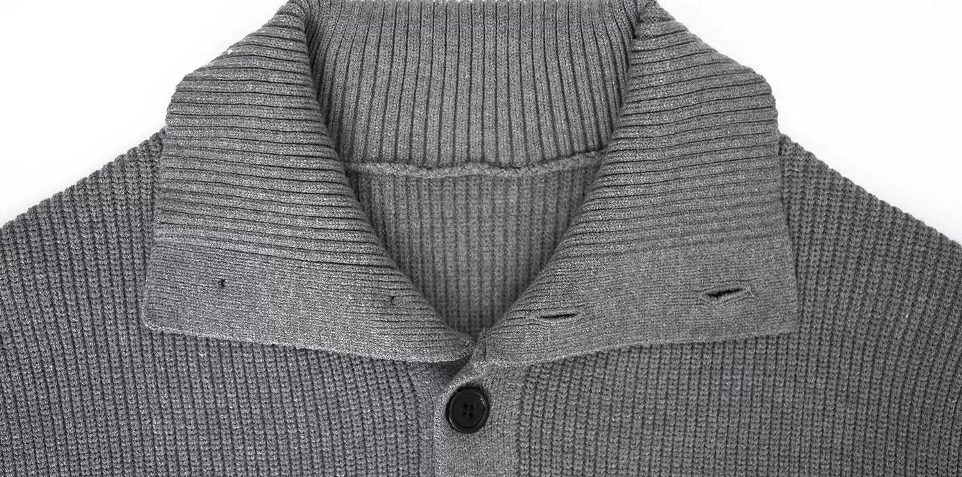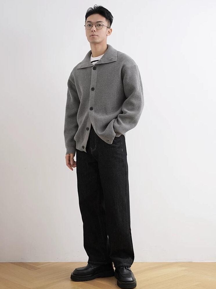 柔らかなグレーのリブ編みカーディガンは、洗練されたシルエットとボタン付きのスタンドアップカラーがアクセント。厚みのあるテクスチャーは心地よさを提供し、カジュアルにもフォーマルにもマッチするデザイン。アウトドアでも自宅でのリラックスシーンにもぴったりの一着です。