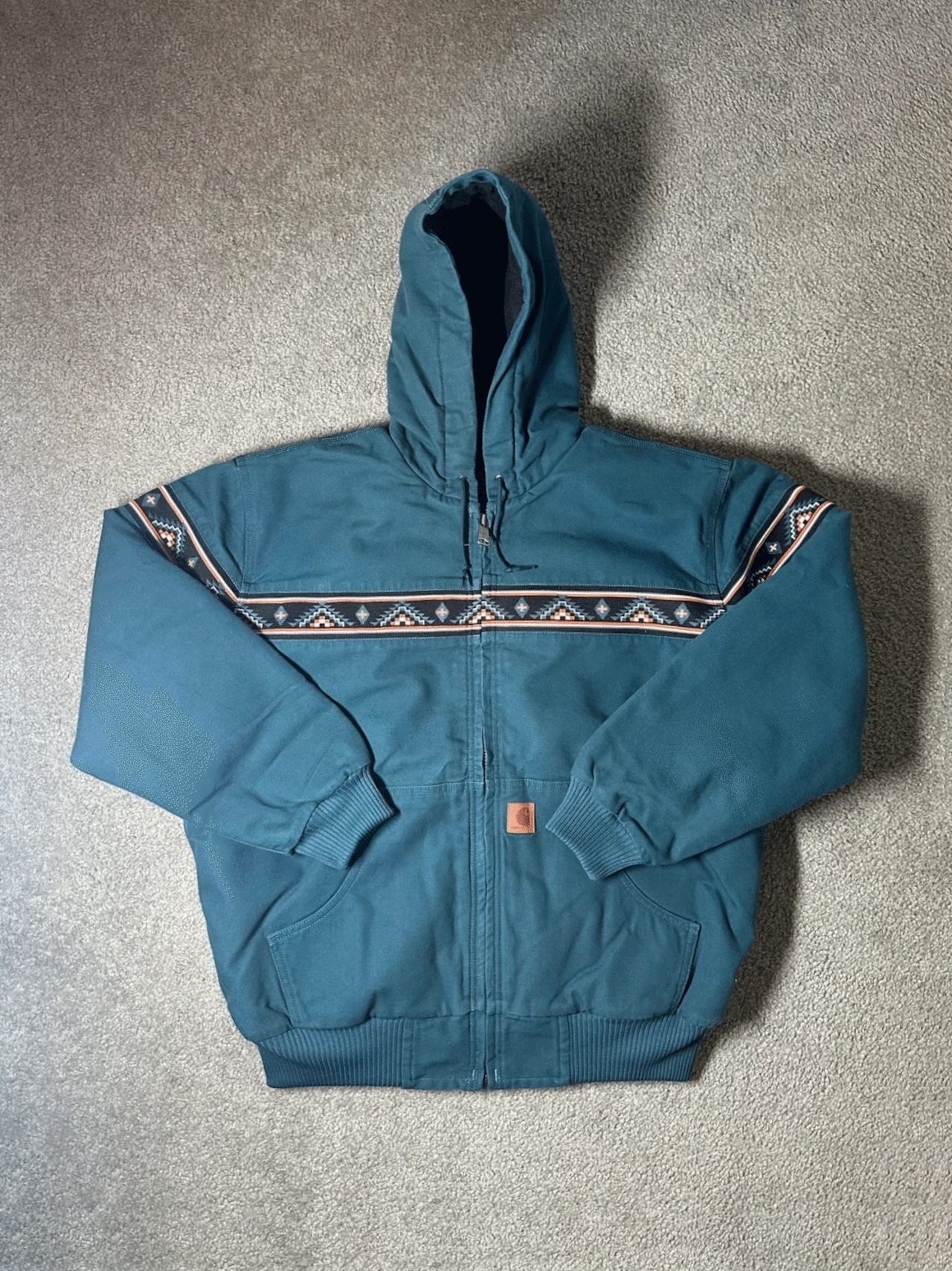 滑らかなテクスチャのコットン素材を使用したフーデッドワークウェアジャケット。個性的な多彩な模様のデザインが特徴で、カジュアルでありながらスタイリッシュな印象を与えます。