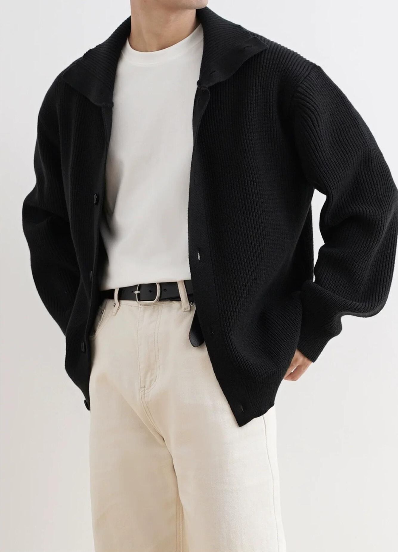 柔らかなブラックのニットカーディガンは、立体的なリブ編みのテクスチャーが特徴です。