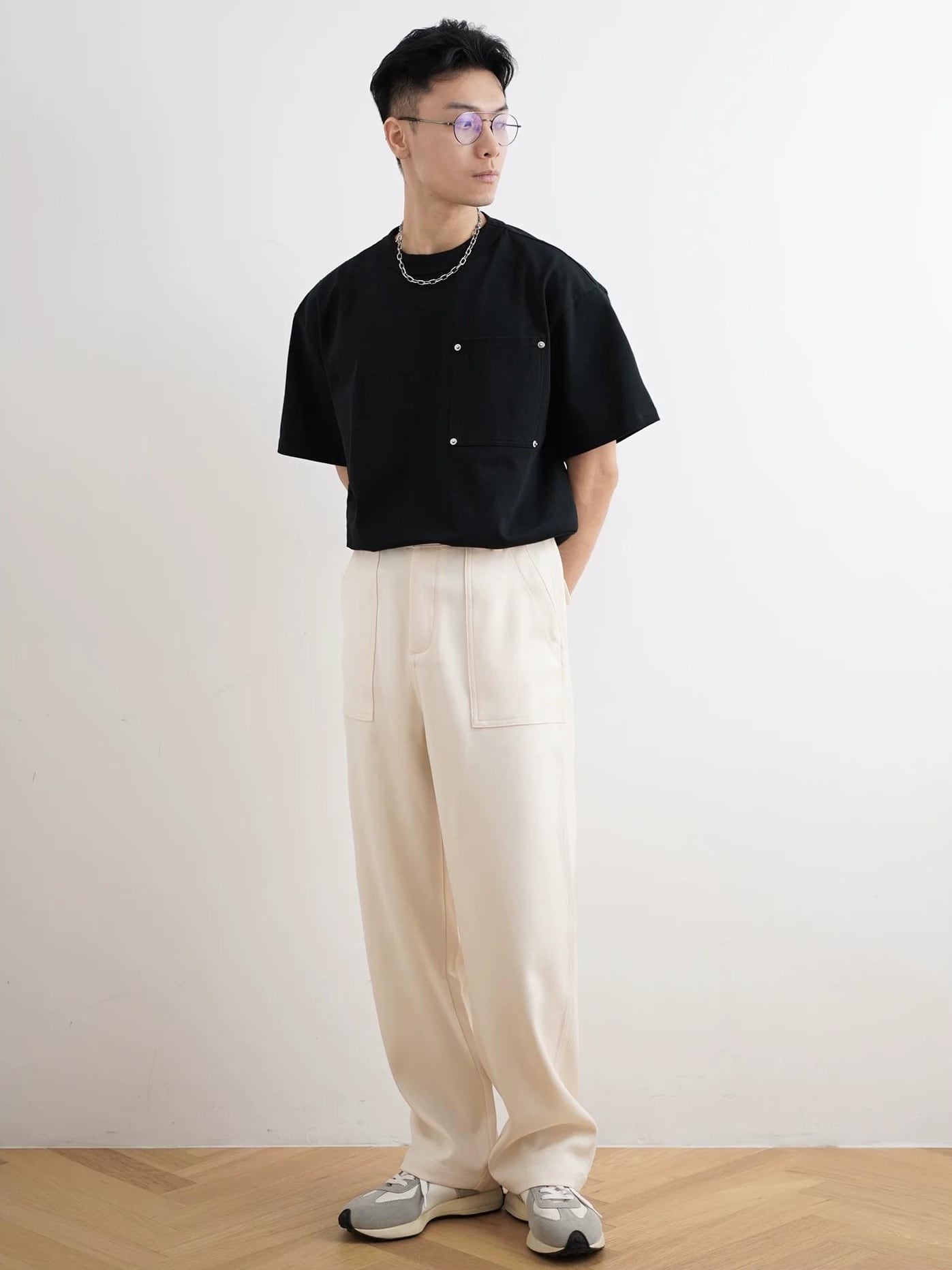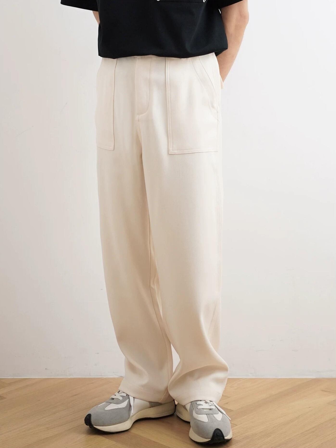 直筒型シルエットと存在感のある大きめポケットデザインが特徴。