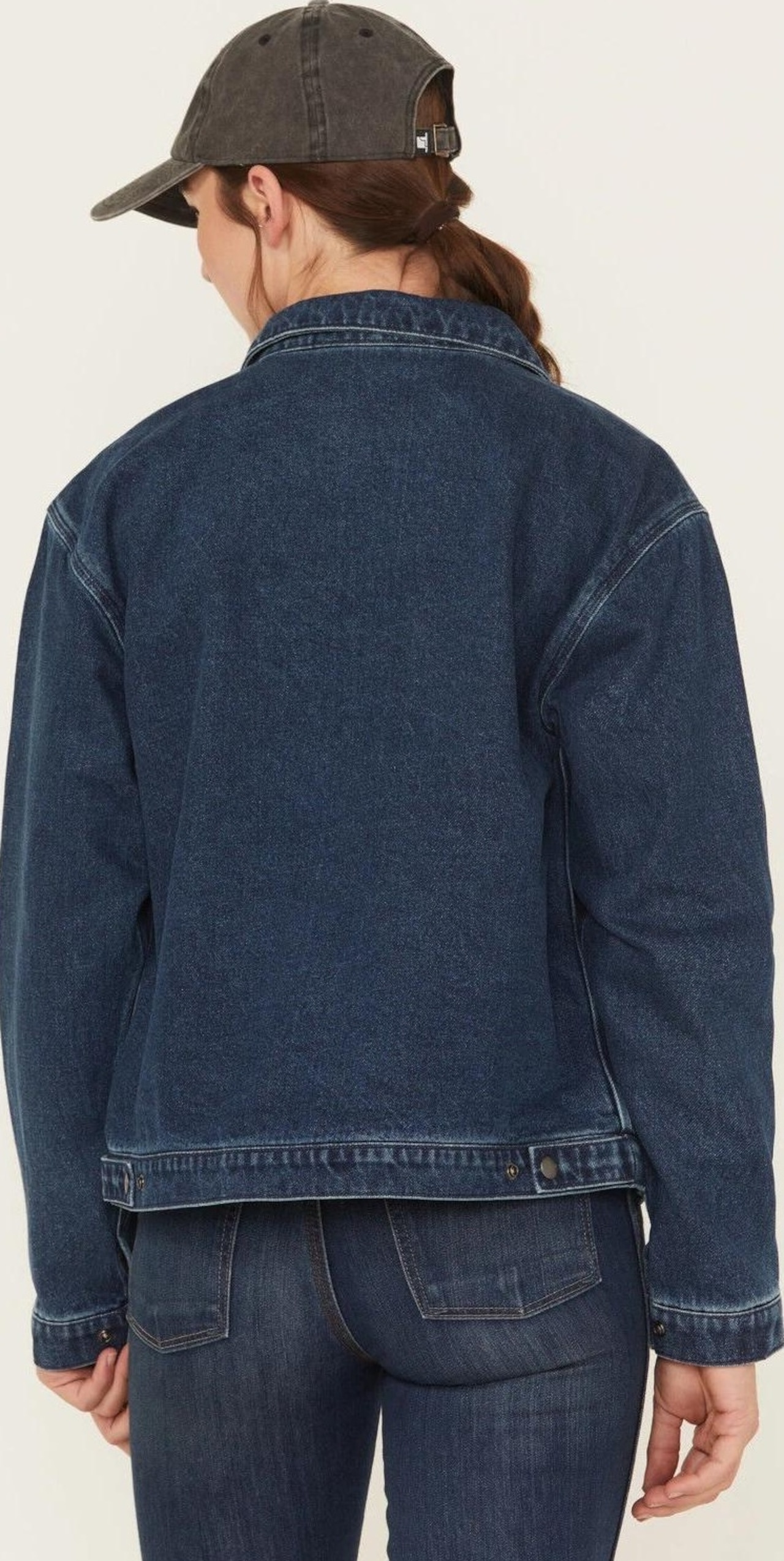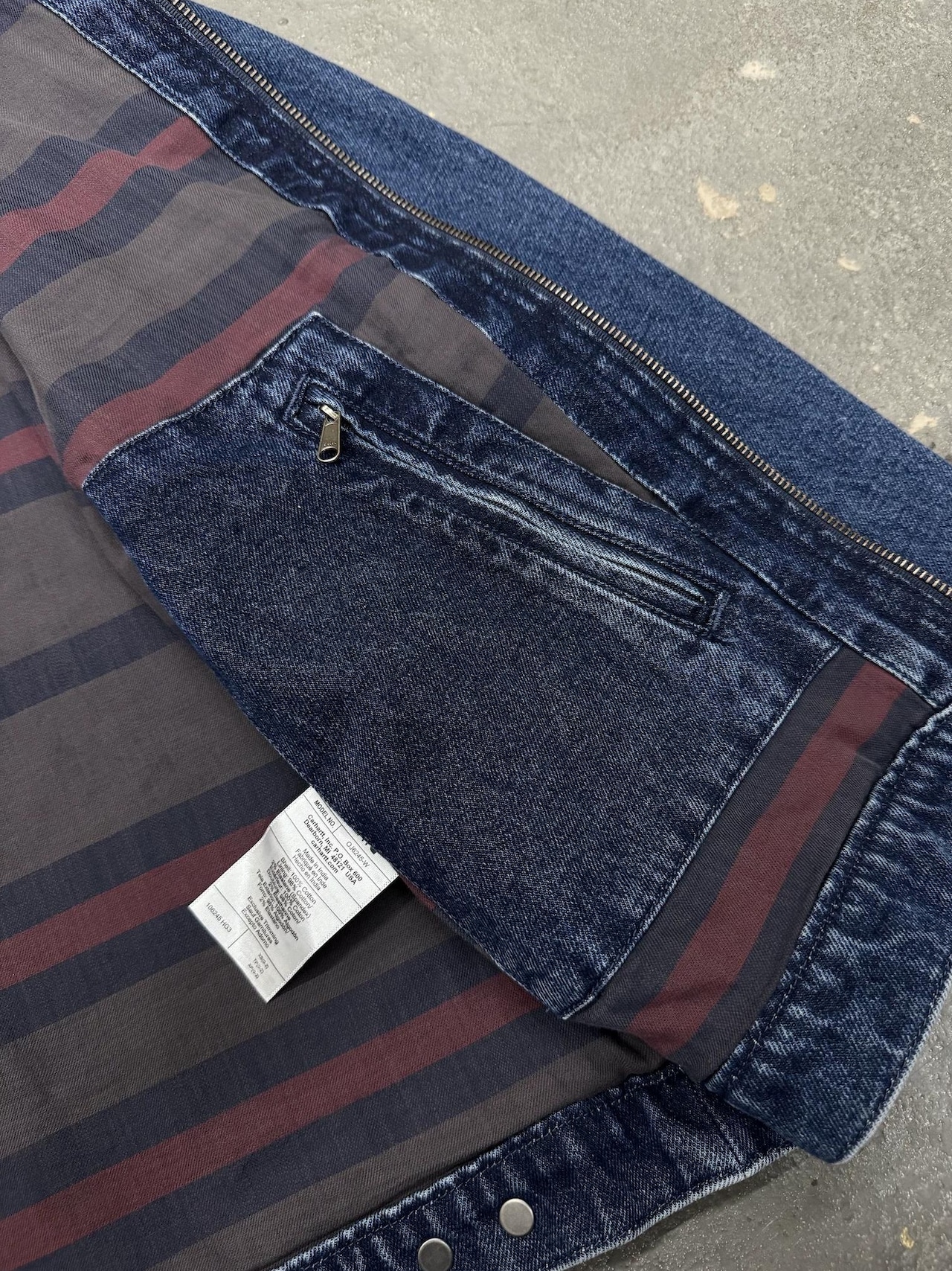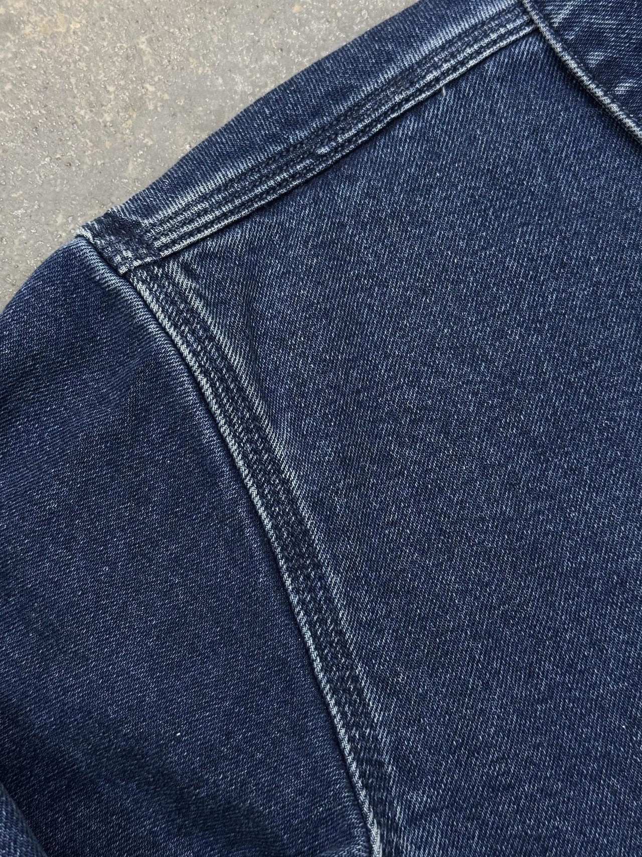 深い藍色のデニム素材を使用したこのジャケットは、カジュアルなスタイルを演出します。