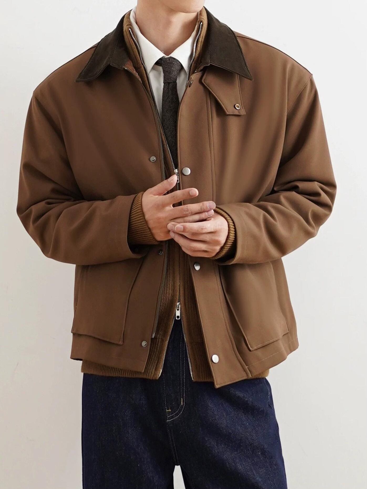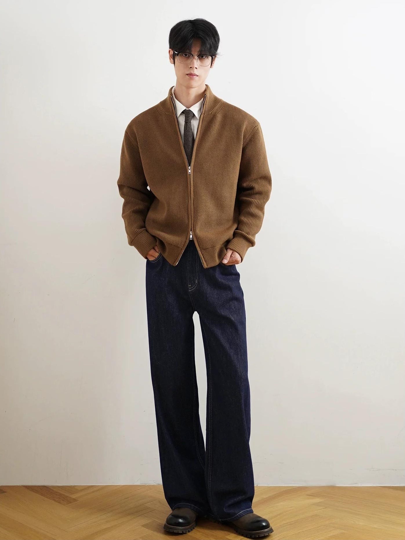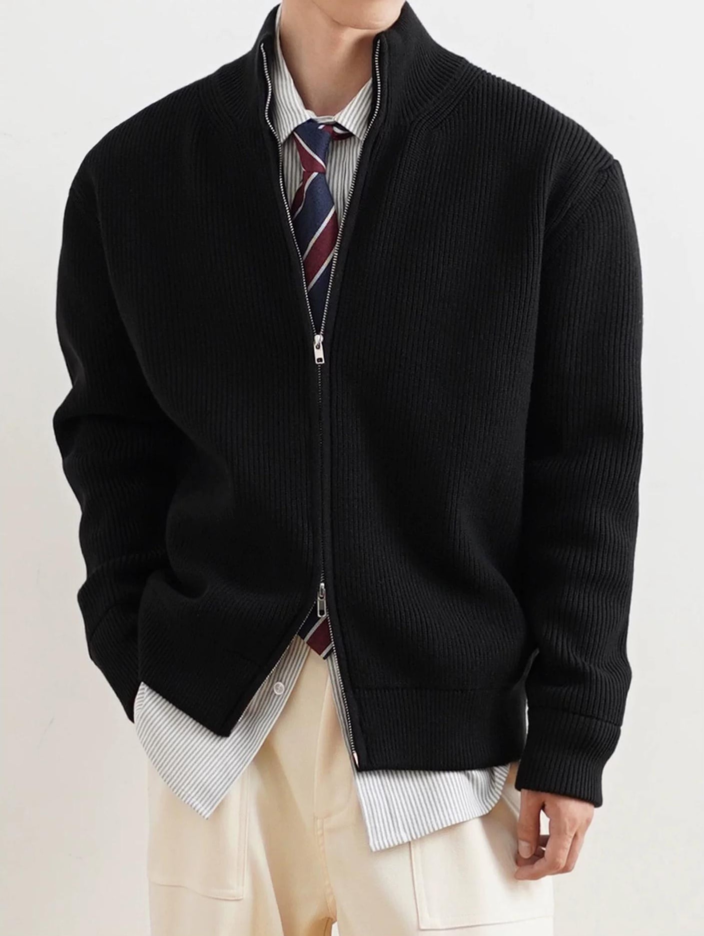リブ編みの柔らかなコットンを使用したカーディガンジャケットです。シングルジッパーと高いスタンドカラーが特徴で、シンプルでありながらスタイリッシュな印象を与えます。